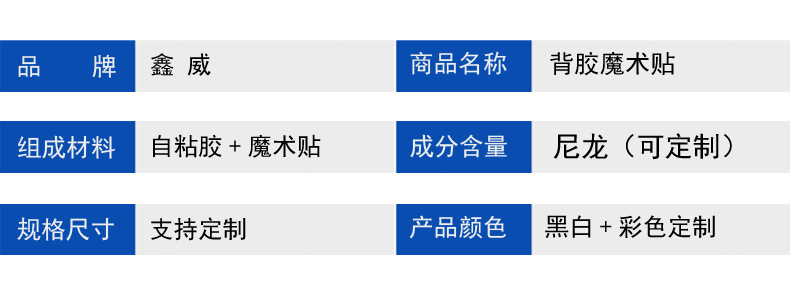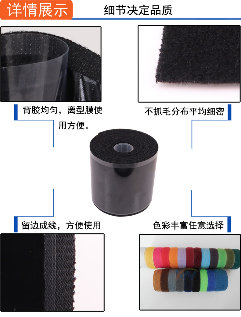 產品材質可根據產品的需求,運用不同(滌綸、滌綸與尼龍混合、尼龍、尼龍A級、不抓毛等)材質的魔術貼。