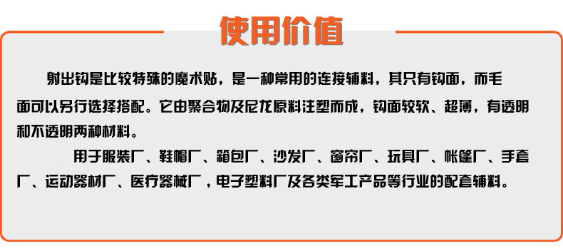 產品應用魔術貼產品廣泛用于服裝、鞋子、帽子、手套、皮包、沙發、車船、座墊、航空用品、雨披、窗簾、玩具、睡袋、體育運動器材、音響器材、醫療器械、帳篷、小輪車護套、各類軍工產品、電子電線、充電器、陳列用具等。