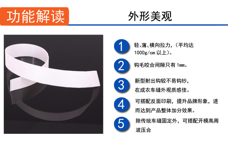 從嬰兒服飾、玩具、醫療綁帶到服裝鞋帽、箱包家紡、運動器械,甚至軍工用品,全場景無縫適配。勾面光滑不傷手,撕拉噪音低,橫向拉力達 1000g/cm 以上,咬合密實不松脫,徹底解決傳統粘扣易斷絲、粘性衰減的痛點。鑫威源頭工廠直供,免費拿樣、品質全程把控,是您降本增效的優質合作伙伴!