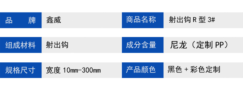 鑫威織造射出勾 R 型 3# 魔術貼,采用一體注塑成型工藝,以優質尼龍 / PP 為基材,打造 YYY 型雙勾結構,是高端場景的理想連接解決方案。勾體高度均勻、密度適中,咬合面積更大,3000 次開合后性能衰退率僅 30%,粘性穩定更耐用。?