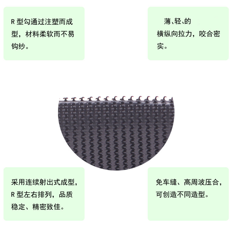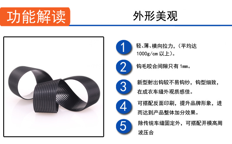 產品兼具多重優勢:一體成型設計讓勾面與基底緊密結合,車縫拉扯不易開裂脫落,抗拉強度遠超傳統織造型魔術貼;勾尖圓角處理,觸感柔和不勾紗、不傷皮膚,適配高檔服裝、醫療護具等精細場景;耐候性出眾,-30℃至 180℃環境下性能穩定,抗老化、防腐蝕,清潔后粘性依舊。?